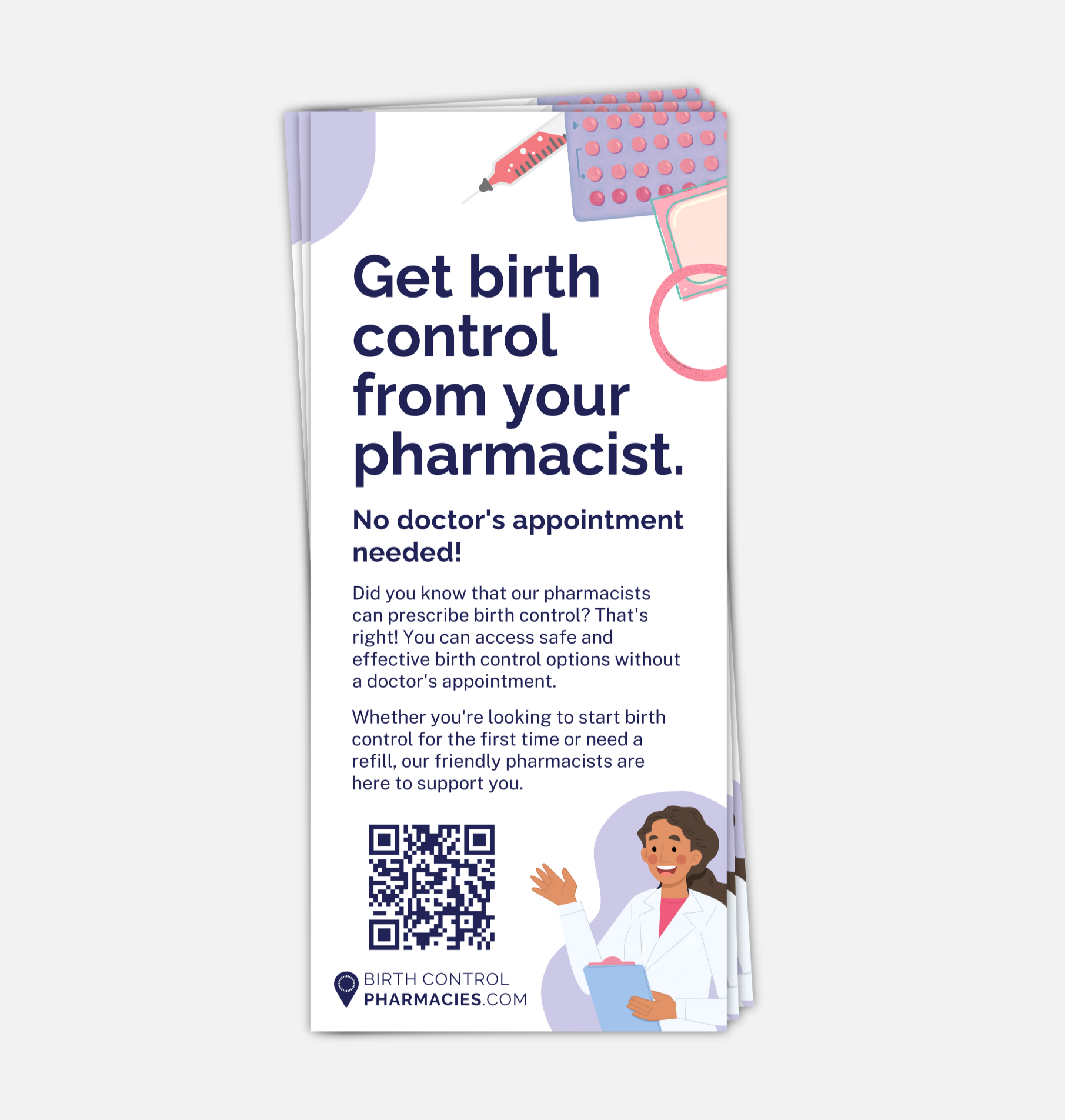 Promote your pharmacy’s birth control services with our professionally designed rack cards. Perfect for your counter or as bag stuffers, these cards clearly inform patients about convenient access to contraception and your prescribing capabilities. Measures 3.74″ x 8.27″